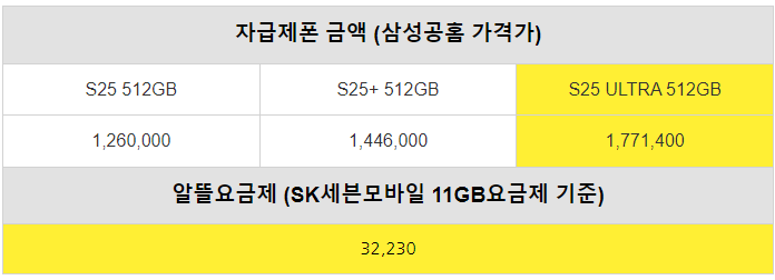 아쉽게 성지에서 S25가 출시된지 얼마 되지 않아 가격이 높게 형성되어있고 선택약정이 아닌 공시지원일 경우 위 알뜰요금제보다는 저렴할 것임.