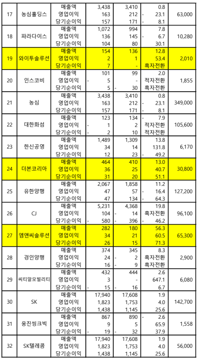 * 노란색은 매출액/영업이익/당기순이익이 전기대비 10%이상 상승 종목