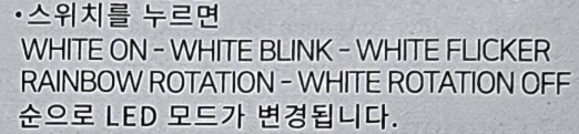 뒤에 스위치를 꾹 누르면 흰색 불빛이 켜지고 누를 때마다 아래와 같이 불빛이 변합니다.