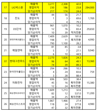 * 노란색은 매출액/영업이익/당기순이익이 전기대비 10%이상 상승 종목