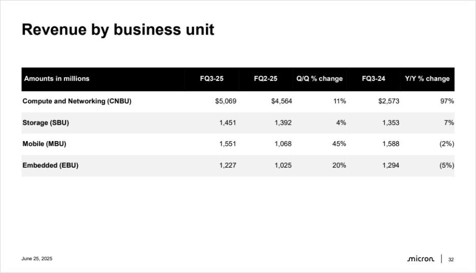 자동차 및 산업 : L2 및 L3 ADAS 기능과 AI 지원 차량 내 인포테인먼트 시스템의 채택 증가가 메모리 및 스토리지 콘텐츠 성장을 주도할 것으로 예상. 마이크론은 "업계 최초의 1β 듀얼 채널 LP5 DRAM"과 같은 신제품으로 이 시장에서 장기적인 성공을 기대.