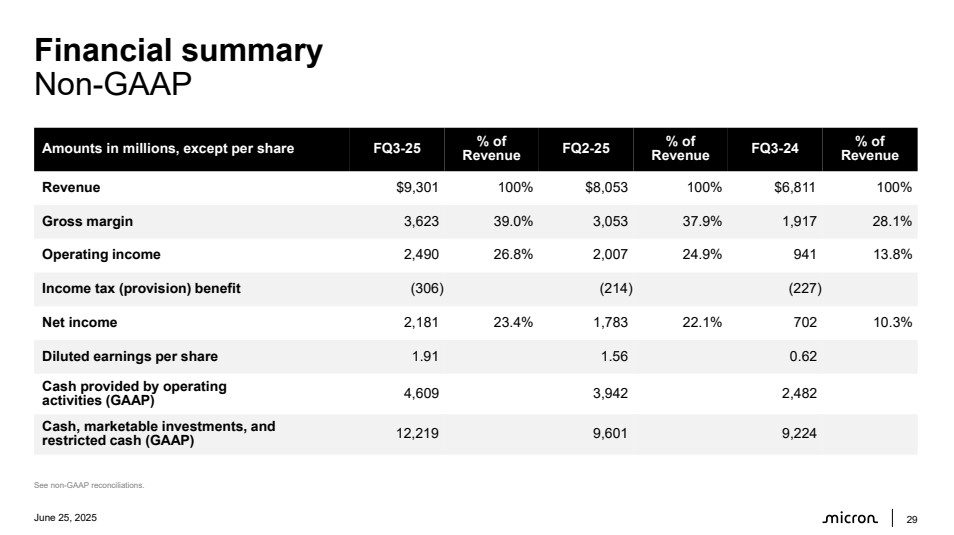 회사는 25년 3분기에 기록적인 매출을 달성하며 강력한 실적을 기록했으며, 특히 주로 데이터 센터 부문의 두드러진 성장과 AI 기술에 대한 전략적 투자 및 시장 리더십 강화되었습니다. HBM 매출은 전 분기 대비 약 50% 성장하여 DRAM 매출 신기록 달성에 기여했습니다. 회사는 강력한 수요 환경을 예상하며 4분기에도 기록적인 매출과 수익성을 기대하고 있습니다.