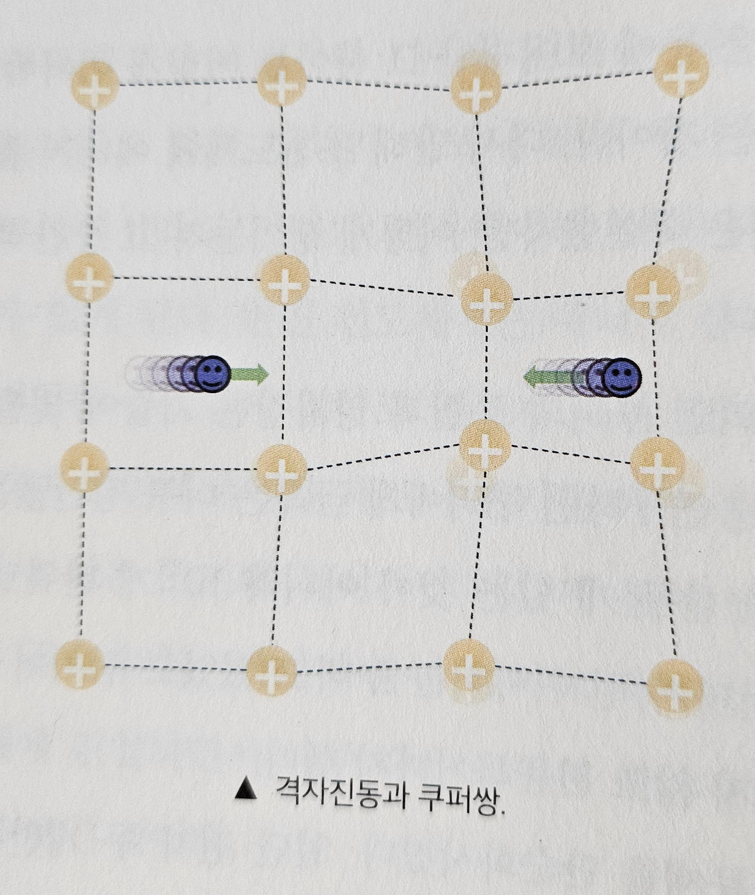 보통 전자는 서로 반발(쿨롱 힘) 하지만, 초전도체 안에서는 격자진동(phonon, 포논)을 매개로 약한 인력이 생긴다.