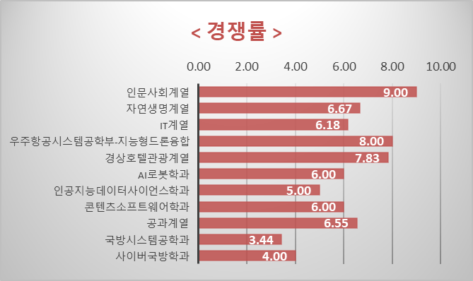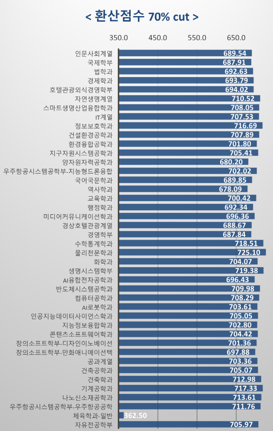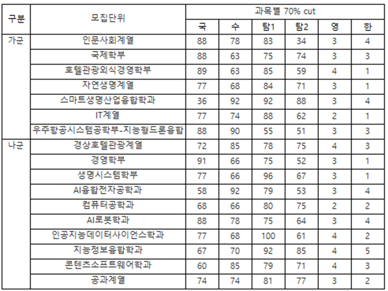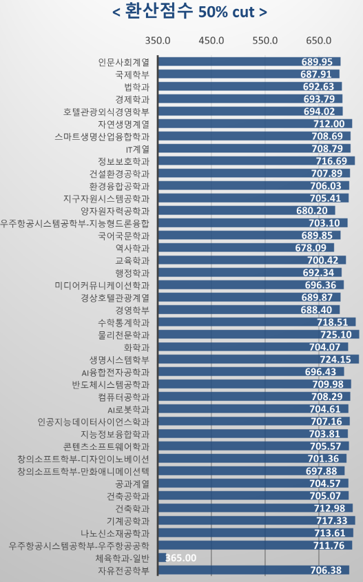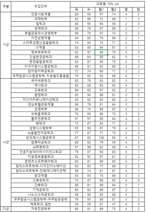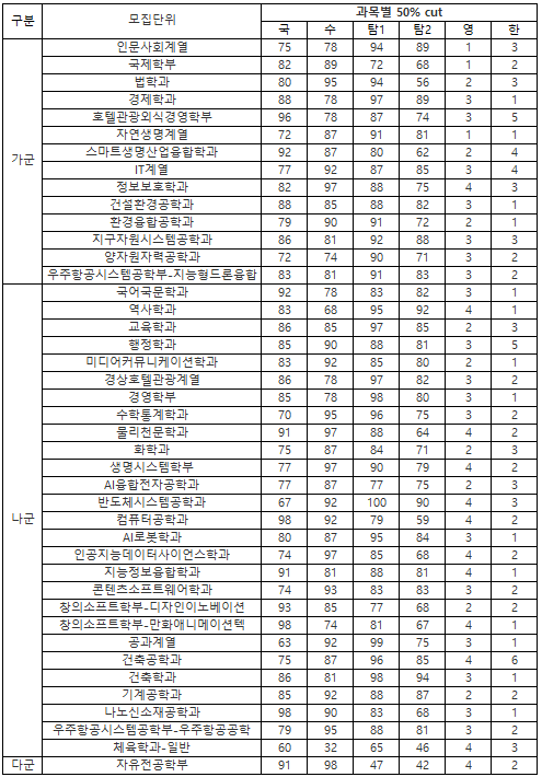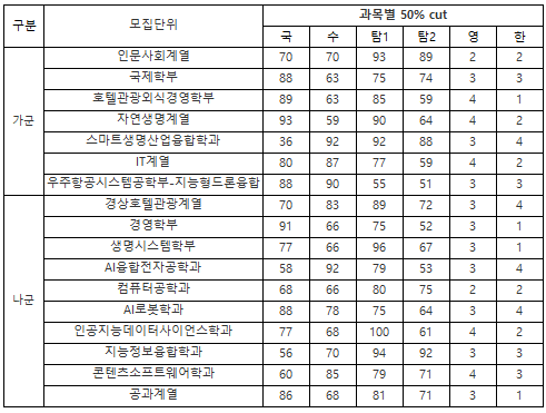 학과별 환산점수 50% cut, 70% cut, 경쟁률 등을 표로 정리하였습니다.