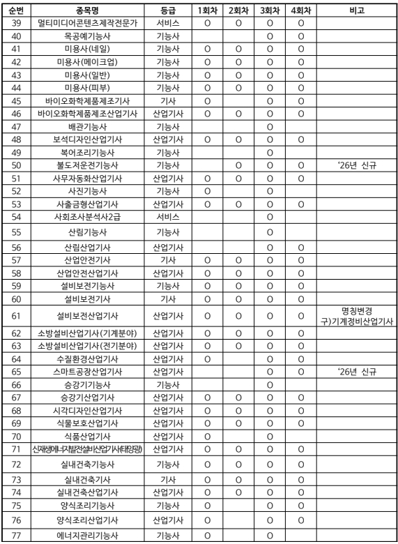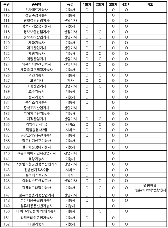 ※ 종목별 각 회차의 시행 여부는 'O' 표시로 확인